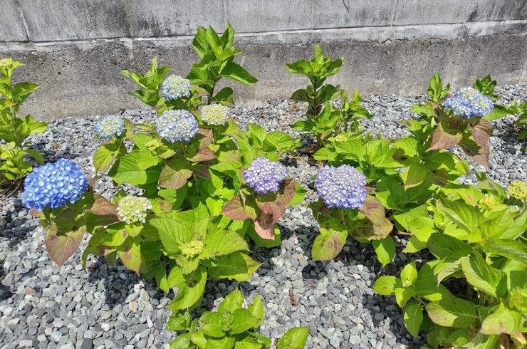 開花間近、紫陽花壇。令和元年に挿し木をして翌春2年に植え付けたものから、今年植え付けたものまで含めて4年越しの紫陽花たち。子供たちの子供たちの子供たちへと続いてゆき、大分美しい花壇になりました。この時期になると一雨ごとに膨らみ色づきとてもきれいです。